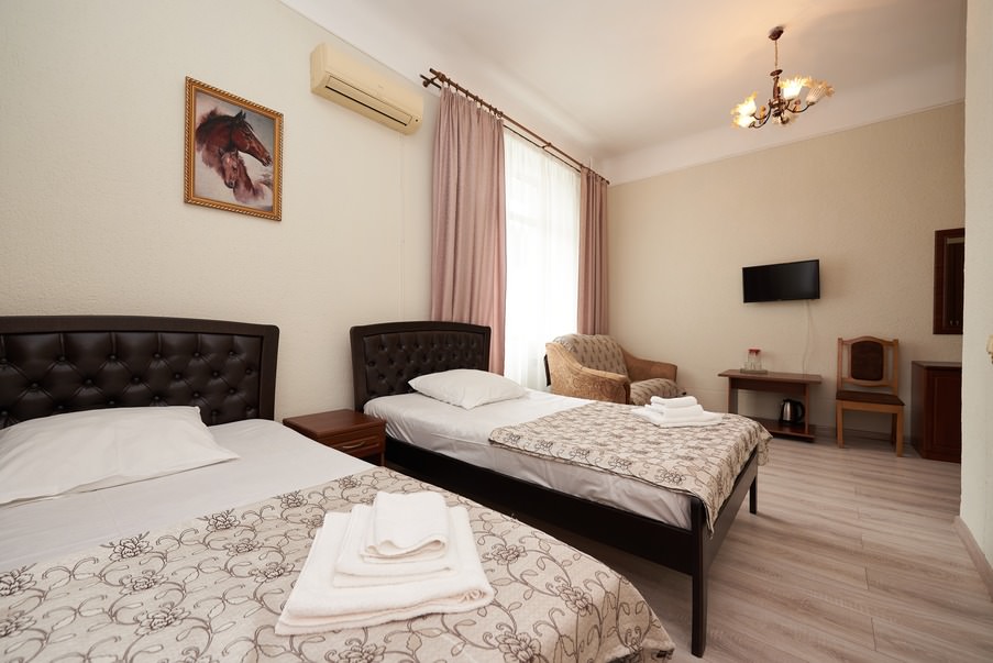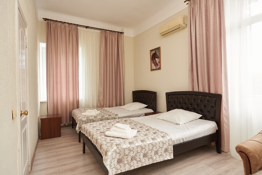 Комфортабельный двухместный 1 комнатный номер со всеми удобствами с балконом, с мягкой мебелью, оборудован двумя раздельными или одной двуспальной кроватью.