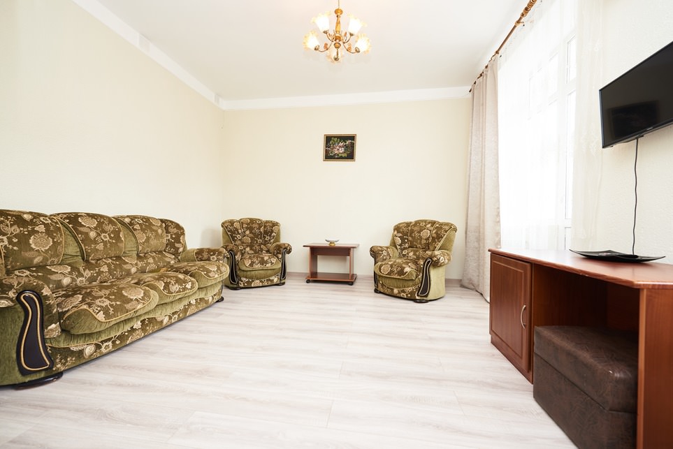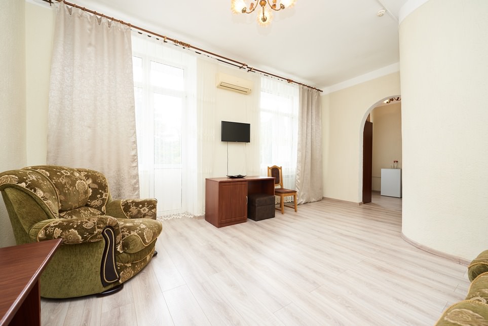 Комфортабельный двухместный 2-х комнатный номер со всеми удобствами с балконом: гостиная с мягкой мебелью, оборудован двумя раздельными или одной двуспальной кроватями.